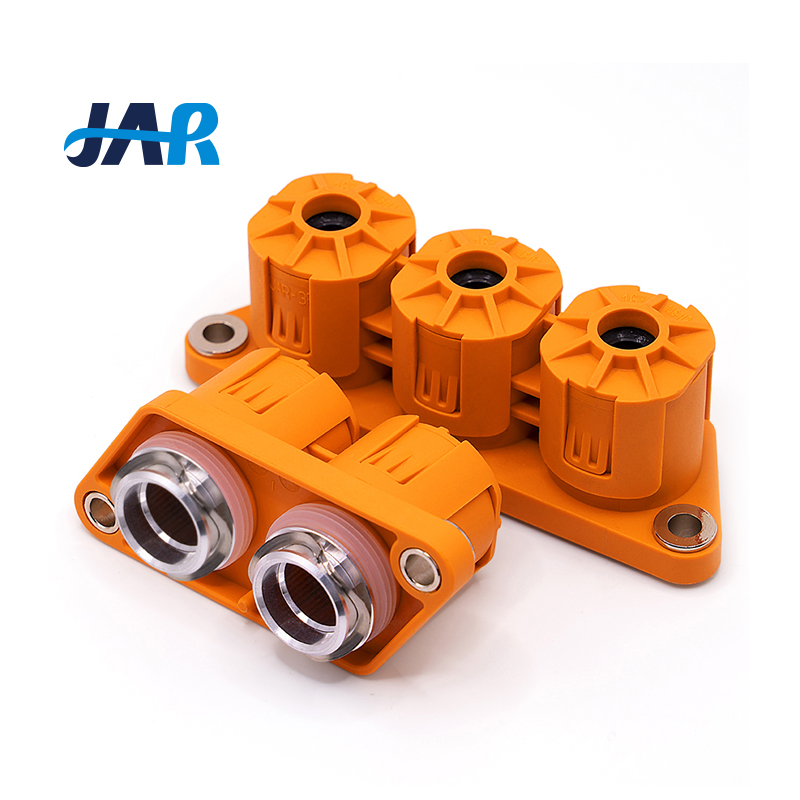 大電流連接器,產(chǎn)品為堵頭形式的接線器,采用注塑工藝,適用于電動(dòng)汽車電氣設(shè)備的出線防護(hù)。產(chǎn)品用M6螺釘安裝在設(shè)備上,連接可靠、操作方便。具有防錯(cuò)、屏蔽、防水等功能。符合QC/T413中“發(fā)動(dòng)機(jī)上”規(guī)定:(10~50Hz振幅2.5mm;50~200Hz振幅0.16mm;200~500Hz加速度250m/s)。